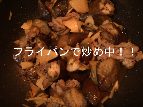 ④なすがしんなり火が通ったら、たけのこを入れサッと混ぜ合わせましょう。